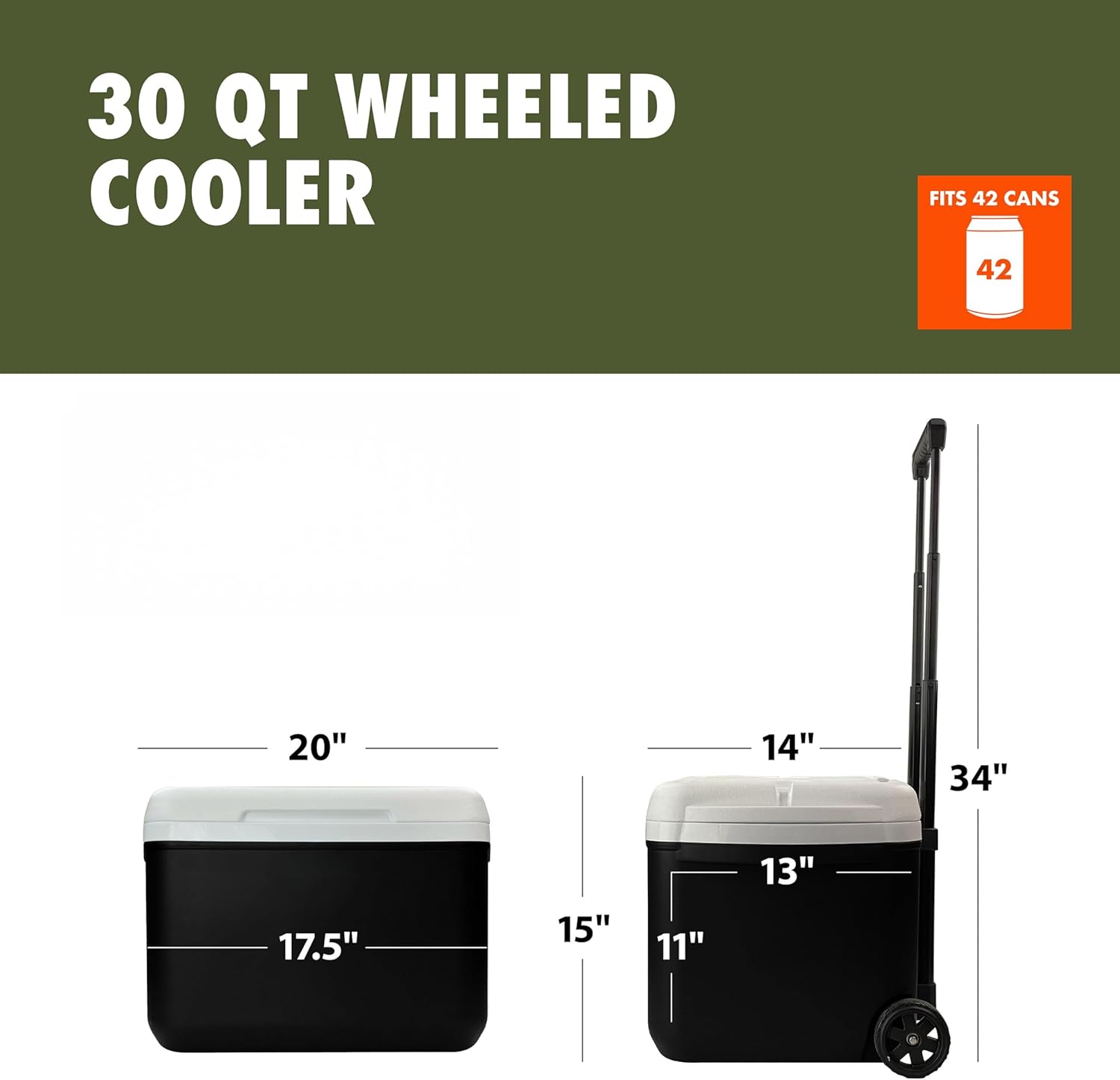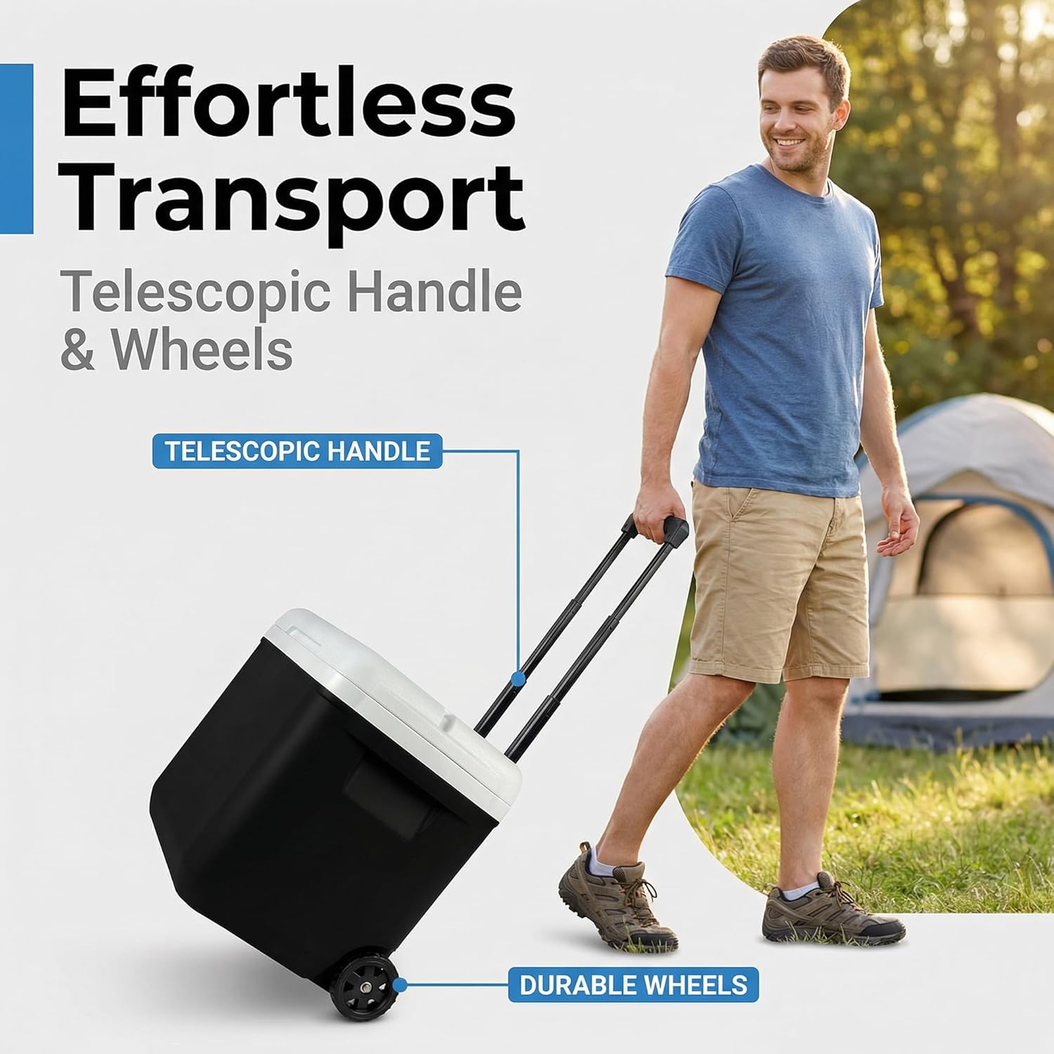 Let's start our outdoor adventure with this wheeled refrigerated box featuring a handle! The extendable handle and sturdy wheels make it easy to reach any destination. The 30QT large storage space can hold 42 cans. The grooves on the lid can also hold two bottles for quick access. During the holiday, you can invite your family and friends to go camping outdoors for fun. With it, you can fully meet your needs. It also uses thick insulation materials, so your snacks and beverages can stay cool until everyone is ready to enjoy them. It is definitely a sturdy and durable outdoor companion.