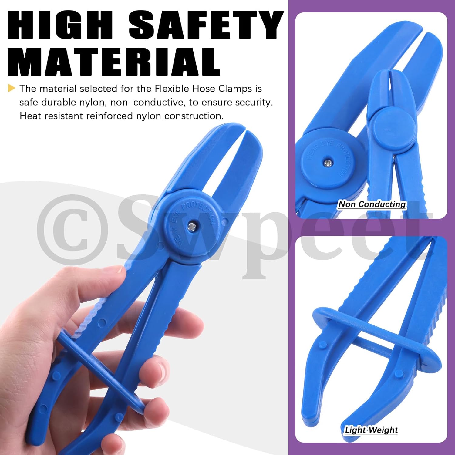 ★ Swpeet 6Pcs Blue Line Clamps Flexible Hose Clamps Kit ▲ WHY CHOOSE US? ✔ 1, This is a set of 6pcs pipe clamp set, it is an essential tool for use on flexible hose lines, brakes, fuel, heaters and radiators. ✔ 2, Heat resistant reinforced nylon construction, Work great for shutting off the fuel supply in rubber hoses. Easy and fast to use. ★ Specifications: ▲ Material: Nylon ▲ Color: Blue ▲ Package Weight: 238g ▲ Application: Mechanic, Workshop, Handy Man Total Length ▲ Plier Opening Range (Approx.) ▲ 155mm / 6.1" ▲ 0-20mm 185mm / 7.28" ▲ 0-35mm 255mm / 10.04" ▲ 0-65mm ★ Package Included: ▲ 6 x Line Clamp Pliers ★ To prevent serious injuries please adhere to the guidelines below: *Wear safety goggles during use. *Use only for repair and remove from the car after use. *Keep hands and clamp away from radiator fans. *Do not use on the damged hoses. *Do not use if the clamp has loose parts. ★ Please note that this set of pliers is not intended for use on rigid, reinforced, or high pressure lines.