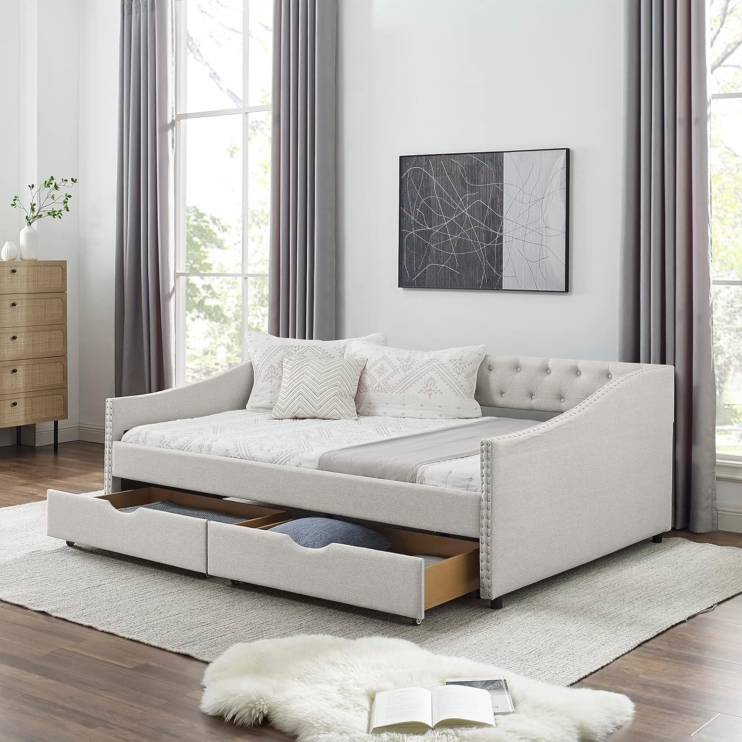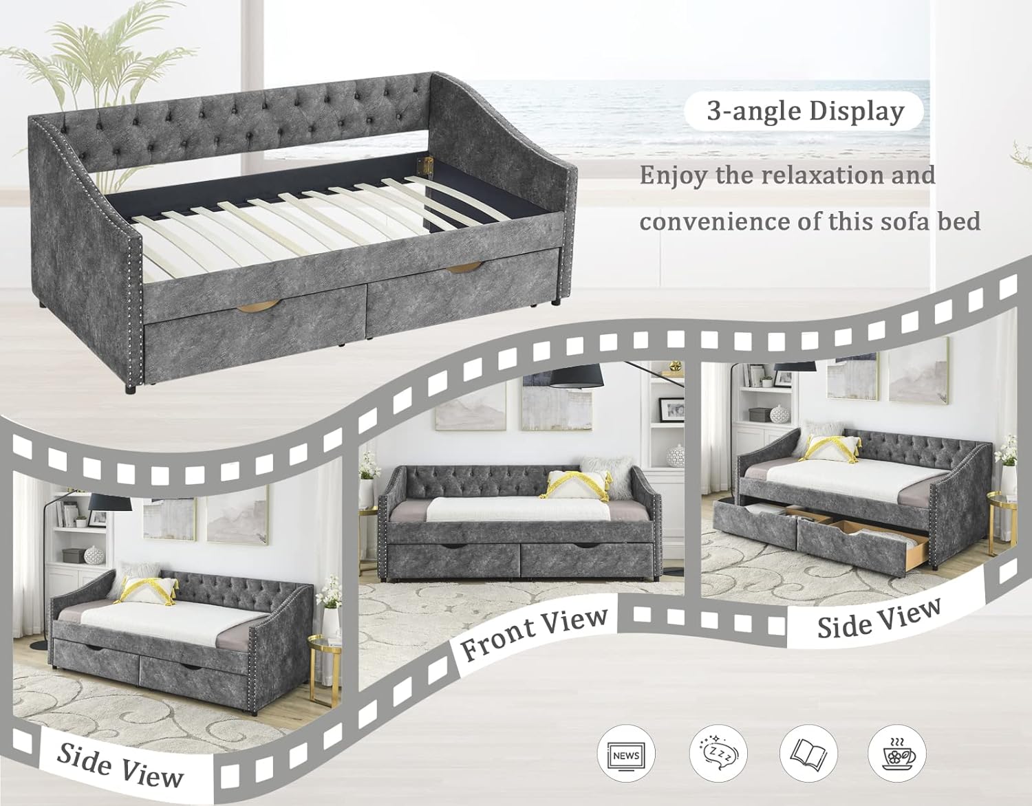 Outstanding Features of Our Upholstered Twin Daybed with Storage: ๐ Bed Frame With Storage Drawers - Provides You With Extra Storage Space Our bed frame comes with two large capacity drawers for easy storage of clothes, pillows, toys, etc. ๐ Solid & Durable Material - Has Great Wight Capacity The bed frame is made of solid wood to provide sturdy and stable support and the weight capacity is 500 lbs. ๐ With Solid Bed Slats - No Box Springs Needed There are 13 solid bed slats that can support your mattress well without using the box springs. Item Specifications: Product Name: Daybed with Storage Upholstery Material: Linen Frame Material: Solid Wood Weight Capacity: 500 LBS Assemble Required: Yes Product Dimensions: 81.5 x 41 x 30.5 INCH Product Weight: 98 LBS